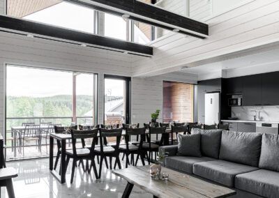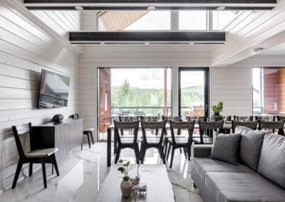 Villa Luxus Helmi 1-3 huvilat on rakennettu Himoksen keskeiselle paikalle, Golf Resortin alueelle, josta on vain noin 500 metrin matka Himos Areenalle ja Centerille. Huvilat on varusteltu laadukkailla materiaaleilla, huonekaluilla sekä astiastoilla ja sen lisäksi jokaisessa huvilassa on myös ulkoporeallas. Huvilan sisääntulokerroksessa on iso ruokailuryhmä 16 hengelle sekä rento sohvaryhmä, jossa isommatkin porukat mahtuvat viettämään aikaa samanaikaisesti. Korkea huonekorkeus sekä isot ikkunat Himoksen Golf viheriöiden suuntaan tuo tilaan avaruutta ja valoa.
