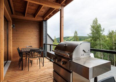 Huvilan keskikerroksesta on käynti terassille, jossa on ruokailuryhmä ja iso kaasugrilli. Pohjakerroksesta on käynti toiselle terassille, jossa on myös istumatilaa sekä ulkoporeallas katoksen alla. Sauna ja kylpyhuone on sijoitettu pohjakerrokseen ja täältä pääsee helposti hipsimään suoraan saunasta ulos vilvoittelemaan tai ulkoporeisiin.